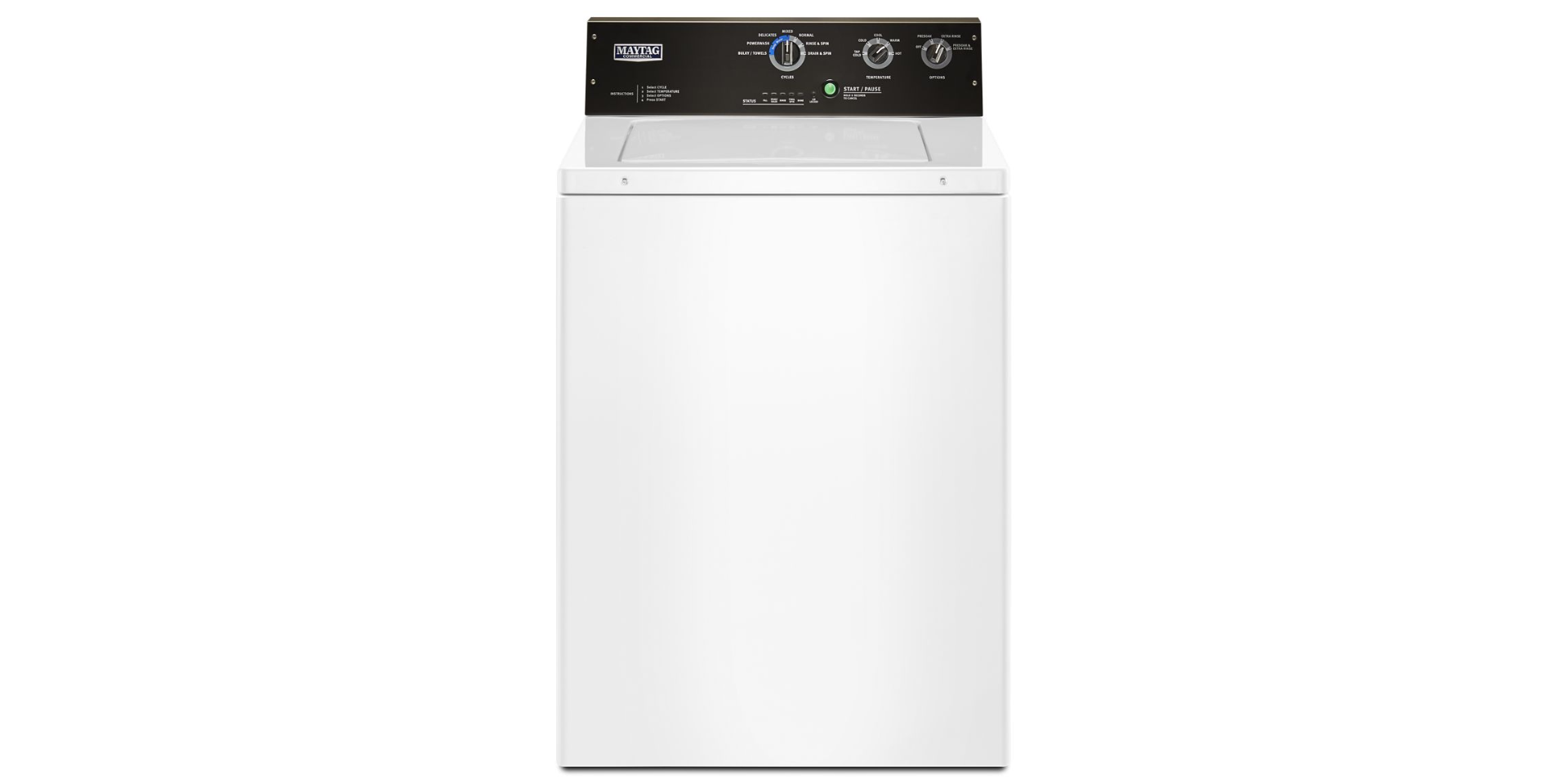 Commercial-Grade Washer We've engineered a powerful commercial-grade Maytag® washer for your home with durable parts, including a 1/2 horsepower motor, galvanized steel panels, and ultra-sturdy knobs that are truly built to last.